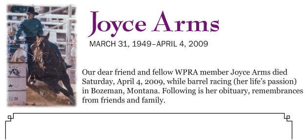 Joyced is preceded in death by her father, William Craddock, father-in-law Ben H. Arms; and her aunt and uncle, Bea and George Wold. She is survived by her husband of 39 years, Ben Arms of Ramsay; daughter and son-in-law, Tammy and Dan Thompson of Ramsay; granddaughters, Samantha and Ashley of Ramsay; mother, Corrine Craddock of Ramsay; sister and brother-in-law, Judy and Terry Archer of Ramsay; mother-in-law and father-in-law, Bevery and Archive Hill of Butte; nephew, David and Janel Archer and family of Jackson, Calif.; niece, Dana and Chris Anderson and family of Belgrade, Mont.; brother-in-law, Jay and Geri and family of Anaconda; sister-in-law, Michelle and Tom Daniels and family of Glen, Mont.; plus her special barrel racing friends.